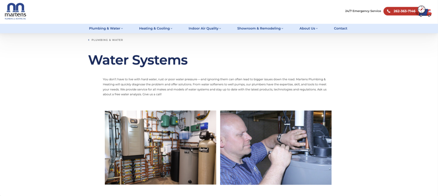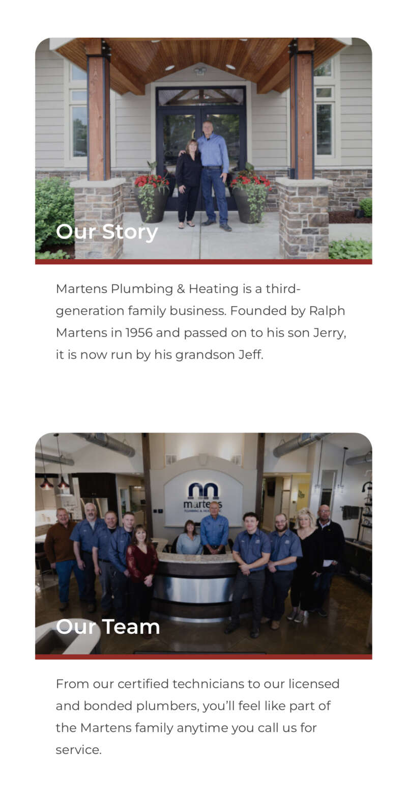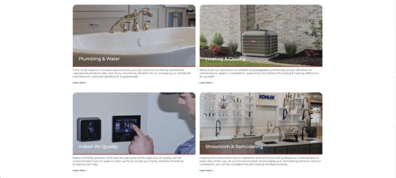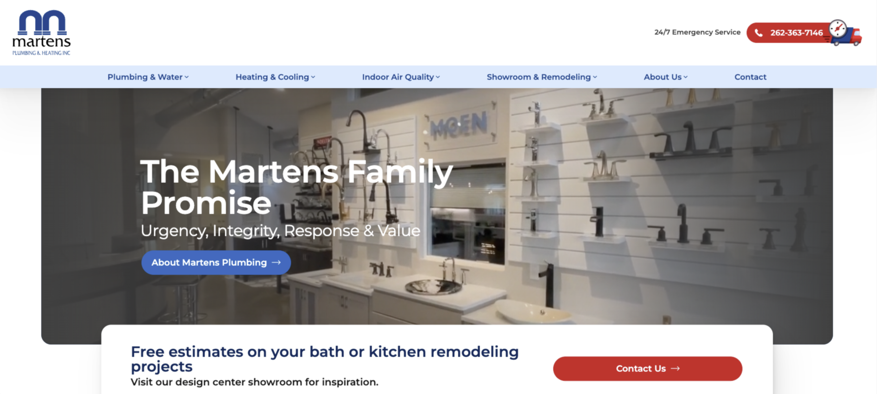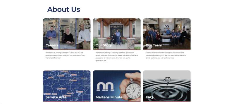 Martens Plumbing & Heating, a family-run business serving Mukwonago and Southeast Wisconsin since 1956, needed a website that would honor their long history while presenting a modern, customer-friendly design. We built a site that highlights their trusted legacy with a dedicated “Our Story” section, giving visitors a sense of the company’s roots and reputation. To boost local visibility, we also built out a full suite of geo-focused service pages, helping Martens connect with nearby customers searching for plumbing, heating, cooling, water treatment, and remodeling solutions. Updated photography and video were incorporated throughout to complement the refreshed design, while the site’s organized layout ensures customers can easily find the services they need.