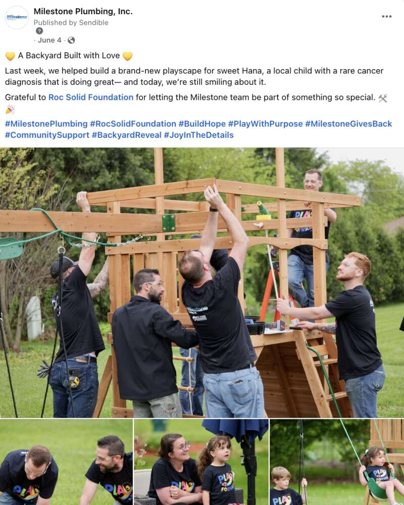 Milestone Plumbing is deeply committed to team-building and contributions to their community. Those two goals came together when Founder Jessie Cannizzaro enlisted her staff to build a backyard playset for a child undergoing cancer treatments. In partnership with the Roc Solid Foundation, a nonprofit that organizes support for young cancer patients and their families, the project required the Milestone team to plan and carry out a mini construction project that would take place in one day at the child’s home.